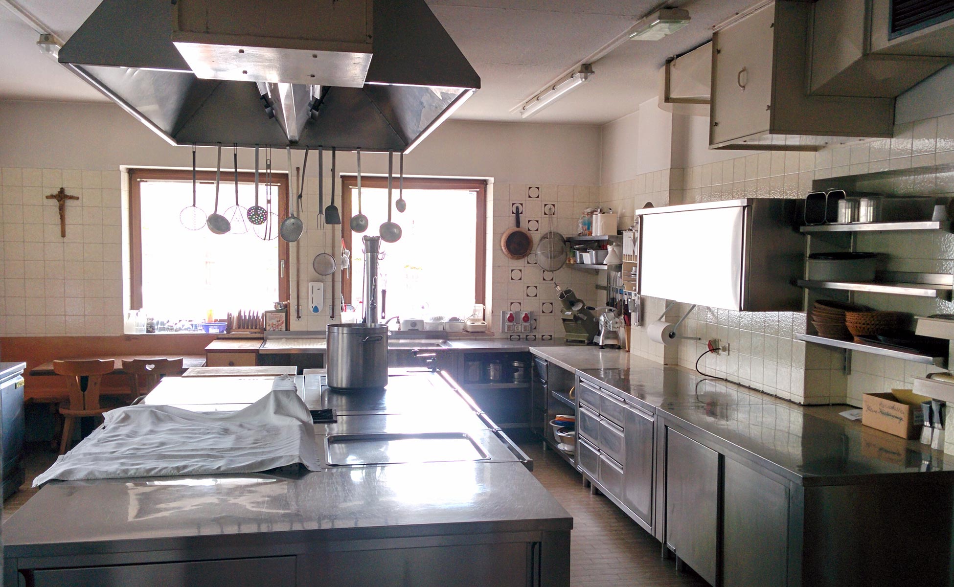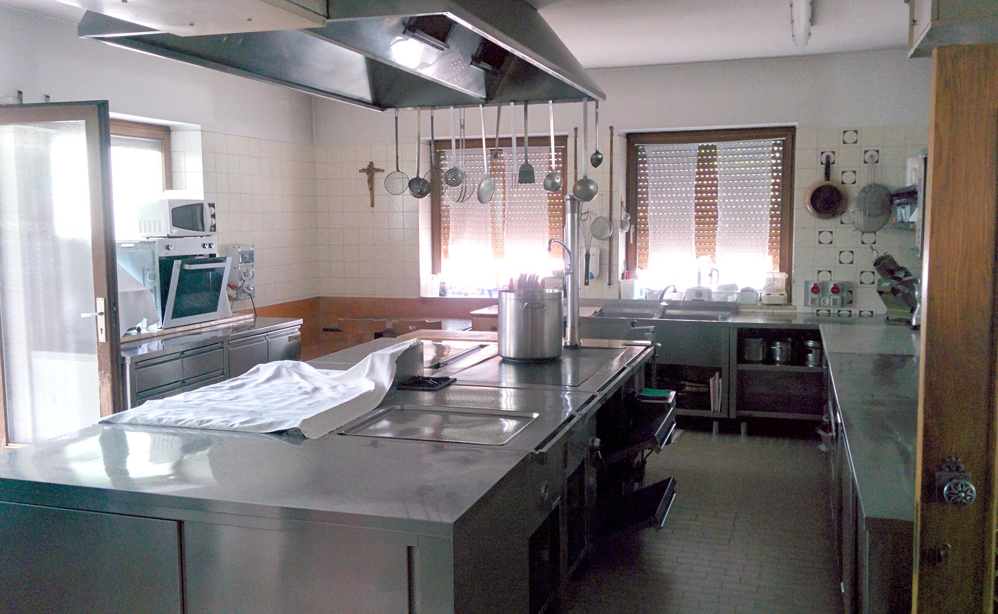 Unsere große Industrieküche (ca. 9 x 5 m) ist bestens ausgestattet und bietet viel Platz zum gemeinsamen Kochen.